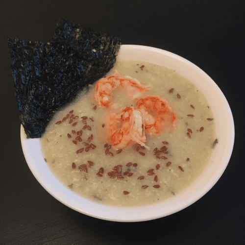Boil the soup for another 5-10 minutes and it's ready to serve. Pour the soup into a bowl, add a few shrimp. You can garnish with flax seeds and slices of dried seaweed.