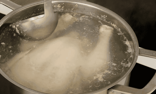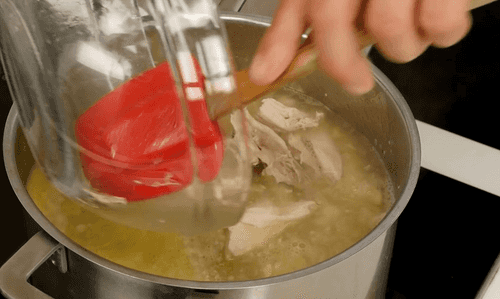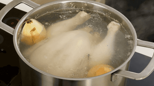 Place a whole chicken in three liters of cold water, bring to a boil, skim off the foam and reduce the heat to a gentle simmer. Add an unpeeled onion cut in half and peppercorns. Cook for one and a half to two hours.