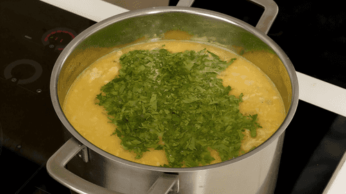 Then, while stirring, pour in the yolk mixture in a thin stream and add cilantro.