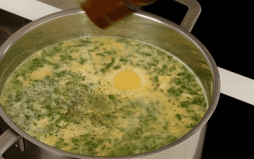 Whisk the yolks with vinegar, add a ladle of hot broth and mix quickly.