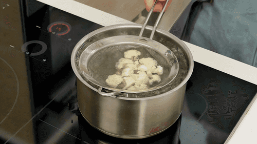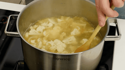 Pour hot broth into the pan with onions and bring to a boil. Add cauliflower and simmer on low heat for 20 minutes until the cabbage is tender.