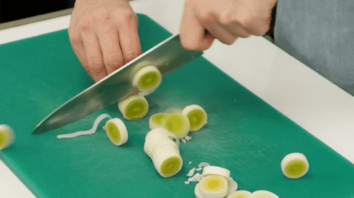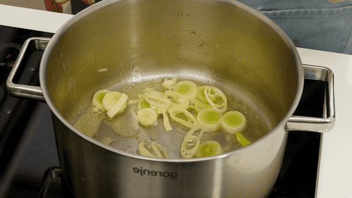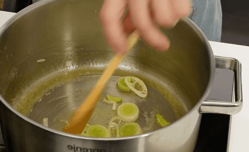In a deep skillet, melt the butter and sauté the leeks over medium heat until soft. Do not let the onion change color, or it will affect the soup's color.