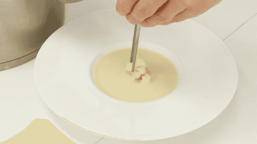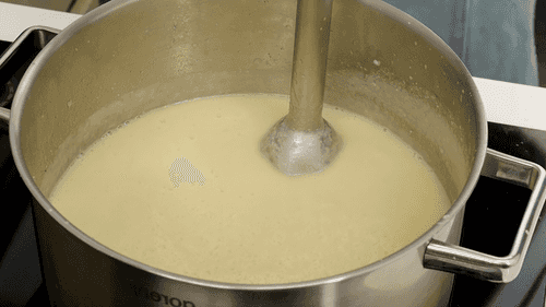 Blend the soup with a blender, add 75 ml of cream and bring to a boil while stirring with a wooden spoon. If the soup is too thick, add another 15 ml of cream, one tablespoon at a time.