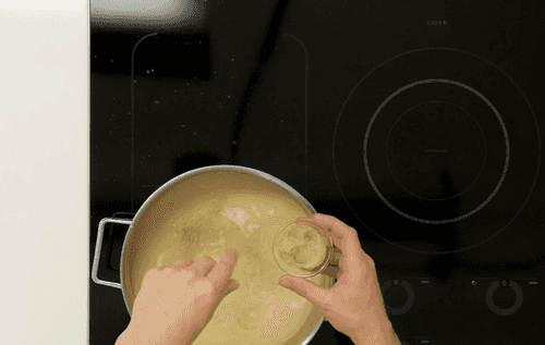 Add flour, mix well, remove the saucepan from heat and let it sit for 10 minutes to cool slightly.