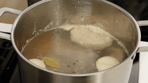 Pour duck meat with 3 liters of water, bring to a boil, remove the foam, reduce heat and cook for 1.5–2 hours, adding an onion, carrot, bay leaf and peppercorns.