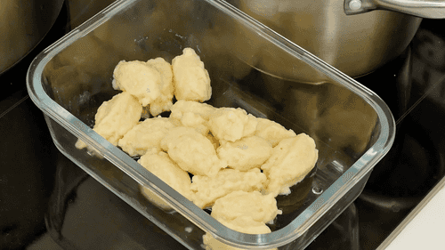Boil water in a pot, generously salt it, and use a teaspoon to drop portions of dough into it. Cook the dumplings until they float, then drain them in a colander.