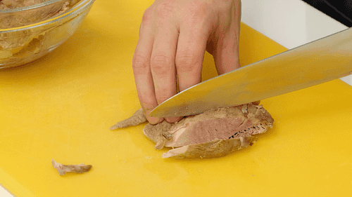Strain the broth, and separate and chop the duck meat.