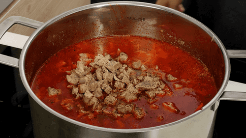 Add sautéed vegetables and beetroot to the borscht, season with salt and pepper to taste. Add dumplings and cook for another 7-8 minutes.