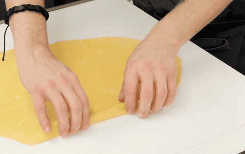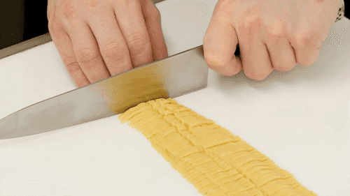 Once the dough has rested, roll it out on a cutting board with a rolling pin — thin enough to see the board through the dough. If you have a special dough roller machine, you can use that as it's even more convenient.