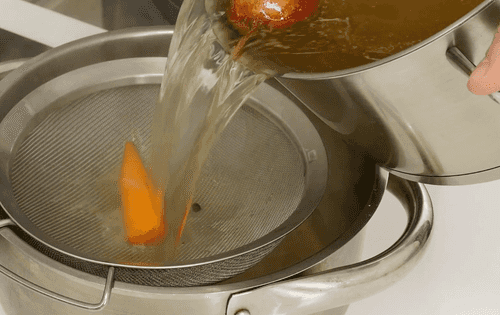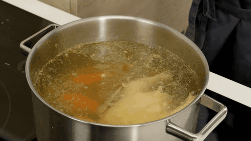 After an hour or an hour and a half, remove the onion, carrot, and chicken from the pot, strain the broth and bring it to a boil again, then turn it off. The broth is ready; it should be very beautiful and golden.