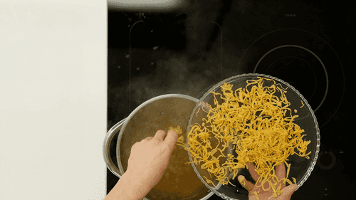 Boil the broth again, add one small bay leaf and all the noodles. Cook the noodles for 5 minutes — and the soup is ready.
