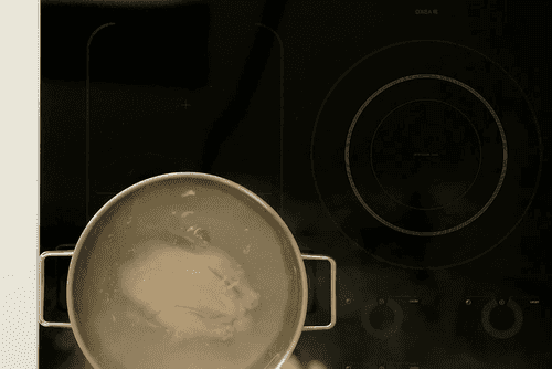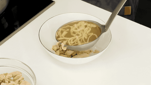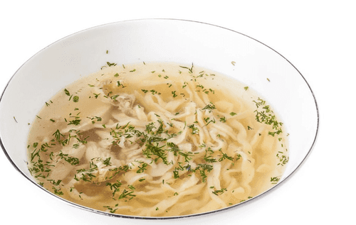 Place 30 grams of chicken fillet in a plate, then pour 250–300 ml of soup.