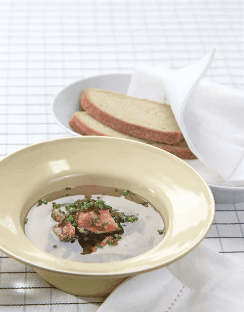 Remove the pot from the heat and let it steep under the lid. Strain the broth. Separate the fish from the bones.