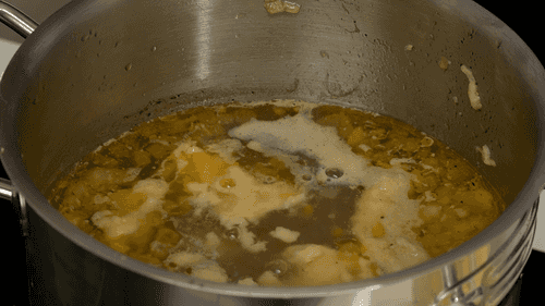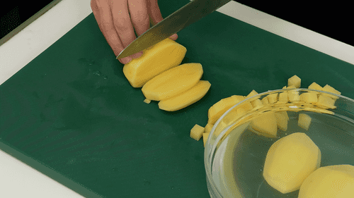 Cut the peeled potatoes into small cubes. Bring the chicken broth to a boil and add the potatoes. Cook for 15 minutes.