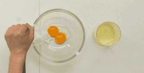 Pour melted butter into the yolks and mix well. Whip the egg whites with a pinch of salt until fluffy and fold them into the yolk mixture.