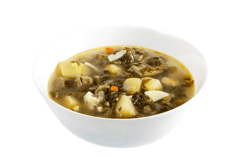 Green borscht with rhubarb leaves is a traditional Russian dish with a refreshing sour taste and unique aroma. This spring soup features rhubarb, sorrel, and basil as the main ingredients, adding brightness and freshness to the dish. A rich turkey broth makes the borscht nutritious, while potatoes and sautéed vegetables add tenderness. Hard-boiled eggs enrich the dish, and sour cream softens the flavor. Green borscht is traditionally prepared during the spring awakening of nature when the first fresh greens and herbs appear. It can be enjoyed hot or cold, savoring the harmony of sourness and spicy notes. This dish is perfect for a light lunch or dinner, providing a sense of freshness and vitality.