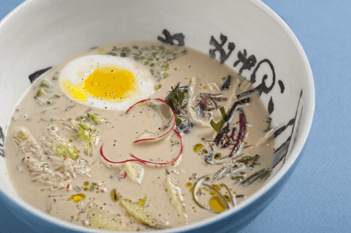 Pour everything into a plate and place a halved boiled egg on top.