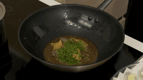 In the same oil, add bay leaf and cumin, fry them for 30 seconds, then add chopped chili peppers and ginger paste, fry for another minute. Add the fried vegetables, chopped spinach, and boiled mung beans, season with sugar and salt, and heat.