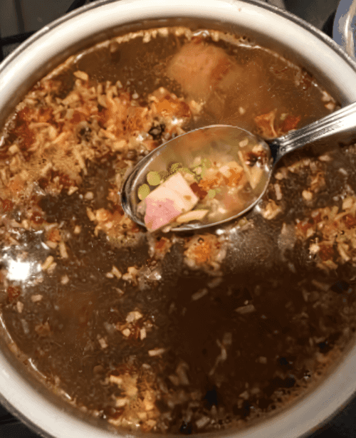 Add the fried pieces of pork to the soup pot 30 minutes before cooking.