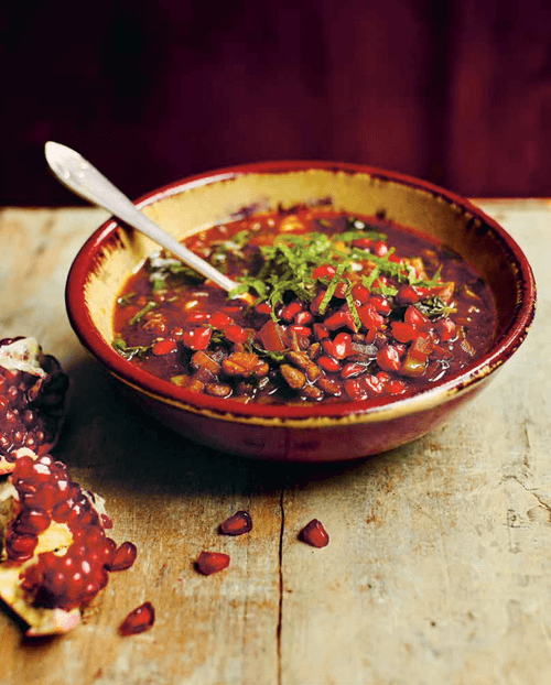 Serve garnished with pomegranate seeds and thinly sliced mint.