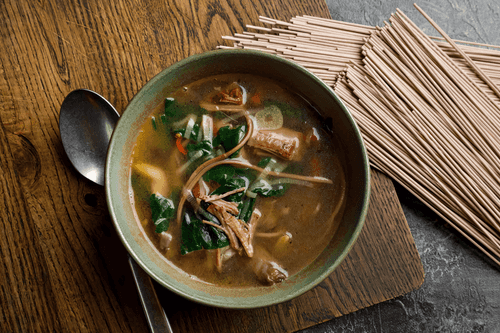 Add buckwheat noodles and cook for another 3 minutes until the noodles are ready, season with soy sauce and salt to taste.