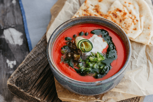 Serve the ready soup with stracciatella or any soft vegan cheese, fresh cucumber, finely chopped jalapeño pepper, and bell pepper.