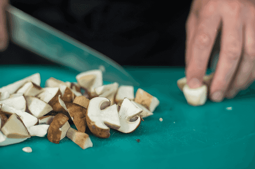Slice the mushrooms to make them uniform in size. Cut small mushrooms in half or quarters.