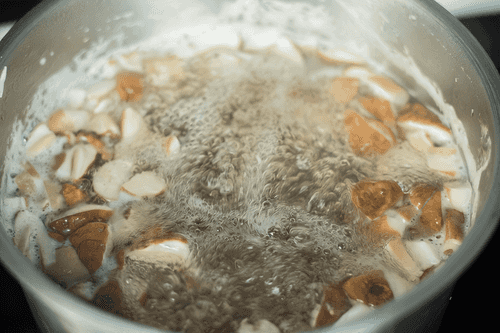 Drain the mushrooms in a colander, pour cold water (3 liters) into a pot and add the mushrooms. Bring to a boil and let the mushrooms cook for 30 minutes over medium heat, remembering to skim off the foam.