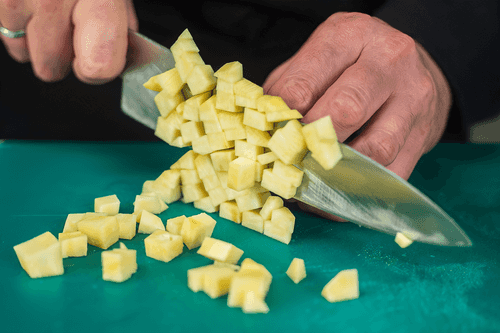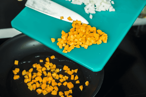Peel the turnip and cut it into cubes, do the same with the carrot and onion.