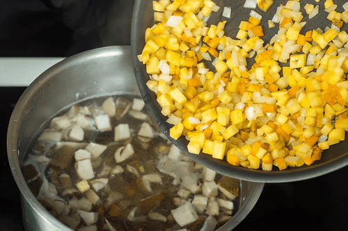 Add sautéed vegetables to the soup. Wait for the soup to boil. The soup is almost ready.