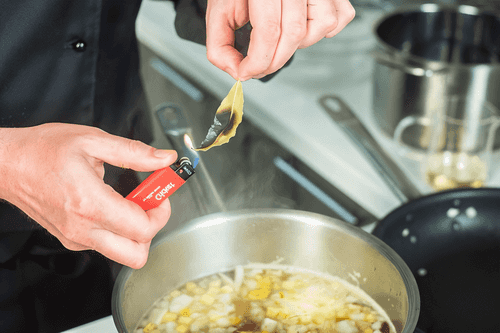 Set fire to a bay leaf and then extinguish it by dipping it in soup. This show is not just for beauty: this way the leaf will release more aroma.