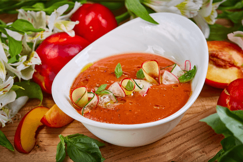 Pour the soup into bowls, drizzle with olive oil, sprinkle with freshly ground pepper, garnish with slices of cucumber, radish, and nectarine, and serve.