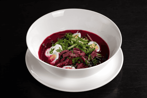 Pour the beetroot soup into bowls, season with salt and pepper, and garnish with halved quail eggs and chopped herbs. Serve with sour cream.