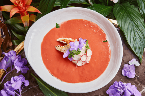 Place crab garnish in the center of two deep plates. Pour chilled tomato soup over it. Garnish with thinly sliced radish, basil, and cilantro.