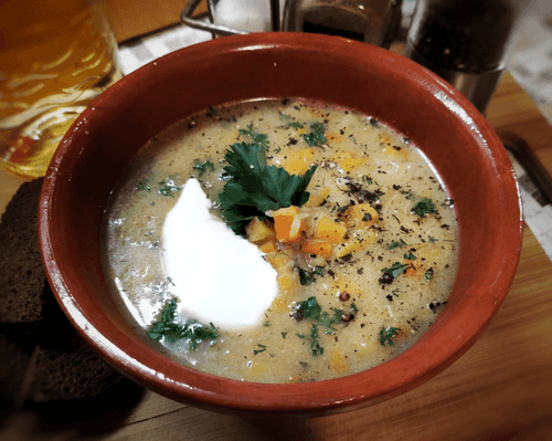 Polish cucumber soup is a traditional dish of Polish cuisine with a unique sweet-sour taste thanks to pickled cucumbers and their brine. Historically, this soup emerged as a way to use available ingredients while giving them rich flavor and nutrition. Chicken broth adds depth to the dish, while vegetables like carrots, turnips, and potatoes provide texture. Rye flour makes the soup thick and hearty, while sour cream softens the acidity of the cucumbers for a harmonious blend. This soup warms well in cold weather and exemplifies balanced cooking – it is nourishing, refreshing, and light at the same time. Serving with dill enhances its aroma and adds freshness. Such soup is often served at family lunches and its taste evokes warm memories of home cooking.