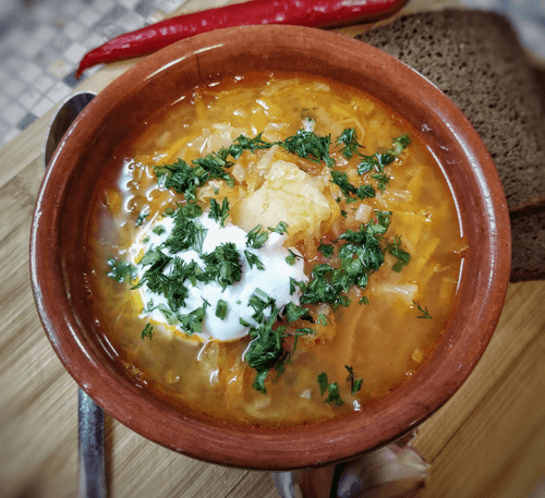 Cabbage soup with sauerkraut and potatoes is a traditional Russian dish rooted in peasant cuisine history. It emerged from the need to preserve vegetables in winter, with sauerkraut serving as an ideal base for a flavorful and nutritious soup. The soup has a rich sweet-sour taste that develops through slow cooking of the cabbage and the addition of tomato paste. Potatoes add tenderness to the dish, while sautéed vegetables provide pleasant sweetness. Spices like bay leaves and allspice add piquant notes. After steeping, the soup becomes even tastier. It is traditionally served with sour cream and herbs, making the dish more harmonious. In ancient times, it was believed that this soup 'does not tolerate haste,' as its true flavor is revealed only after long simmering and steeping.