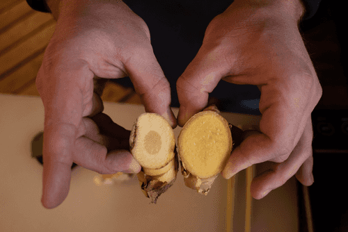 Pour water into the pot and place it on the fire. You can use any broth instead of water. Chop the galangal and ginger, smash them with a knife, and add to the pot.