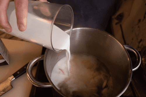 At this moment, coconut milk can be added. Bring the entire mixture to a boil. The milk and water should become a homogeneous mass.