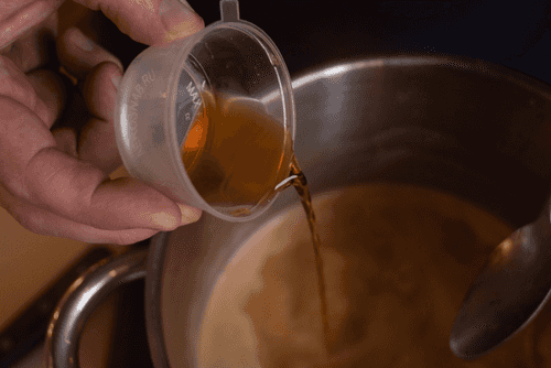 Add tom yum paste to the soup and stir. Tom yum paste is an acidic medium. If added to the broth and then milk is poured in, it will curdle. Therefore, it should only be added afterwards.