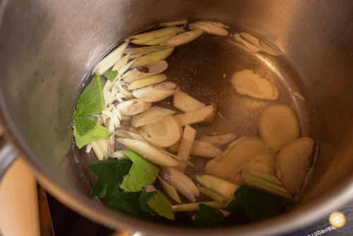 Smash lemongrass with a knife and chop it. Peel the garlic and crush the cloves with a knife. Tear the kaffir lime leaves by hand. Put everything in a pot.