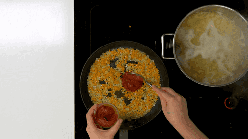 Add tomato paste to the pan, mix, and fry for another 2-3 minutes.