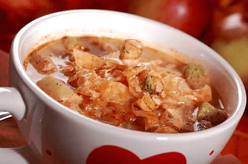 Wash the cabbage and cut it into small squares. Slice the roots and onion, place them in a soup pot, and lightly sauté in oil or fat taken from the broth.