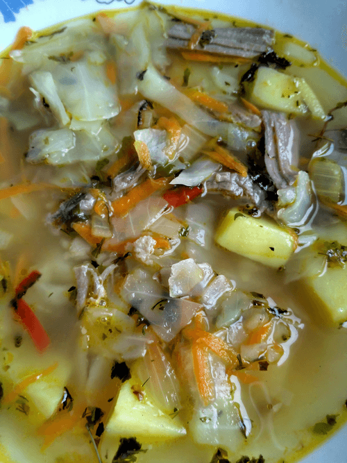 Put the meat broth to boil. After 1 1/2 - 2 hours of boiling, remove the meat and strain the broth into a soup pot, adding pre-fried roots and onion; then add the meat, chopped cabbage, and boil for 30-40 minutes. 5-10 minutes before finishing, add pepper, bay leaf, and salt to the soup.