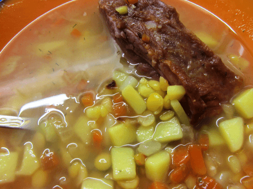 In a pot of boiling water, add peas and cook for about an hour. Take fatty smoked pork ribs, cut along the meat, and if large, chop in half. Cook like regular meat in broth with the peas.