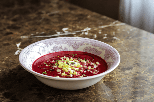 Place randomly chopped beetroot, sautéed onion, cucumber, and ice in a blender. Add dill, parsley, shiso, and ice. Blend everything until smooth.