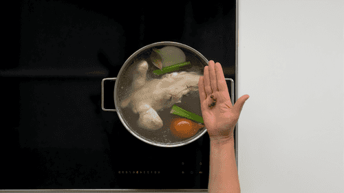 Place chicken bones in a pot and cover with water. Bring to a boil, reduce heat, and skim off the foam.