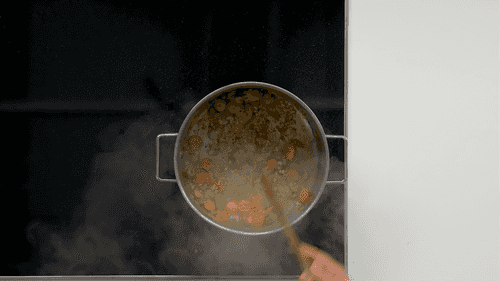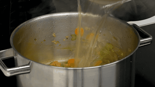Then add garlic, ginger, and turmeric, mix, pour in the strained broth, add thyme and rosemary, season with salt and pepper. Bring to a boil.