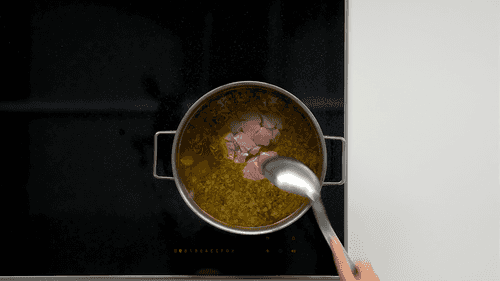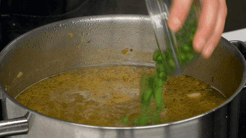 Remove the ready soup from the heat and add frozen green peas. Do not cook it, otherwise it will lose its color.