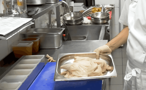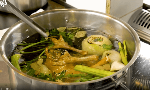 Pour 15 liters of water into a pot. Add chicken, onion, carrot, parmesan rinds, and bay leaf. After boiling, reduce the heat to low and simmer for 10-12 hours. The result should be 8-10 liters of rich broth.
