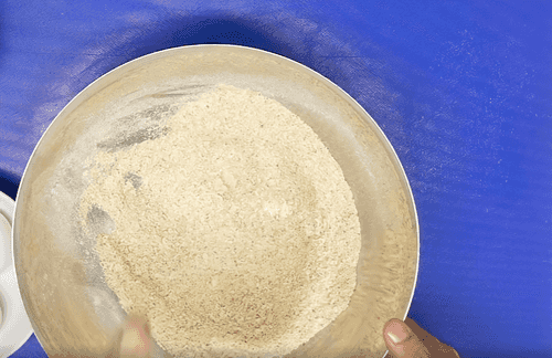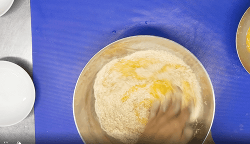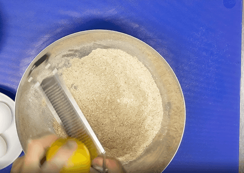 Gradually add eggs to the dry mixture, alternating with adding wheat flour, and mix.